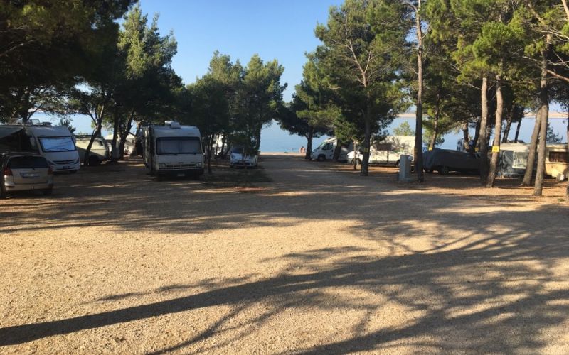 Autocamp a Tribanj (Tribagno). Relativamente piccolo e di recente apertura (07/2016) il Navis si sviluppa su una pineta quasi pianeggiante sita direttamente sul mare.