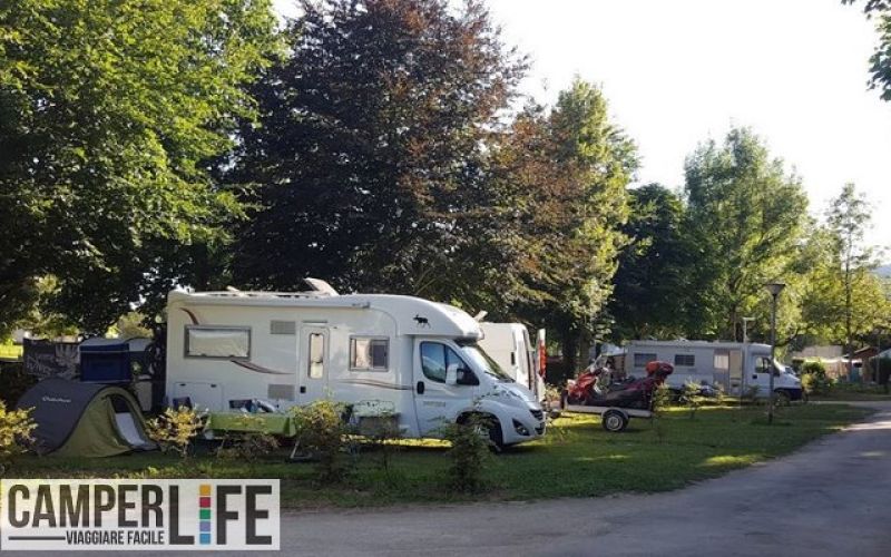 Campeggio con piazzole su prato parzialmente ombreggiato da piante, sulla riva del fiume a pochi passi dal centro, aperto da maggio a settembre.