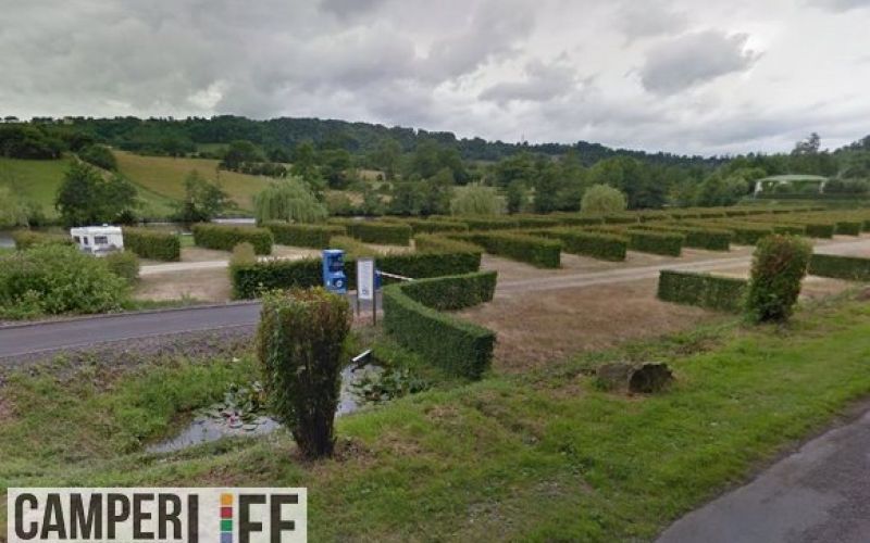 Area sosta con piazzole delimitate da siepe situata sulla riva del fiume Orne a 500 metri dal paese. Accesso e pagamento automatizzati, allaccio corrente elettrica per ogni piazzola, CS agevole.