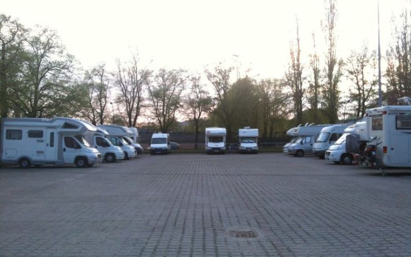 Parcheggio misto adiacente lo stadio, completo di camper service e corrente, con capacità massima di 20 mezzi, Sosta illimitata, Aperto tutto l'anno