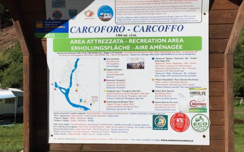 Area attrezzata sulle rive del torrente Sesia all'inizio del paese, dispone di 120 posti, 50 allacciamenti elettrici. Apertura annuale ma nel periodo invernale non sono disponibili i servizi di acqua, carico e scarico. Wifi gratuito.