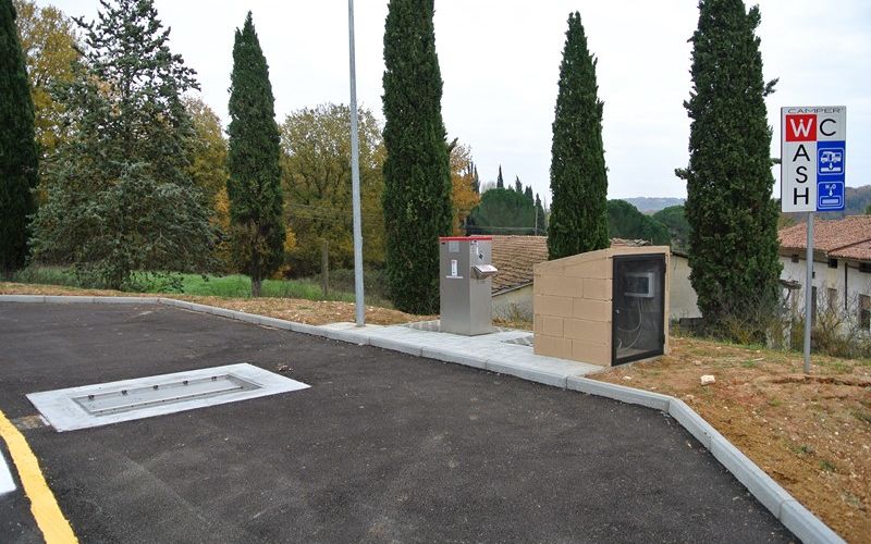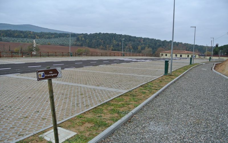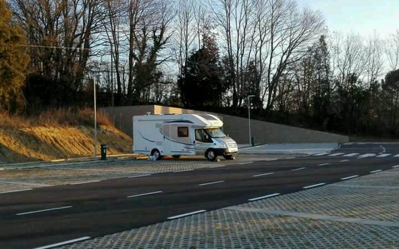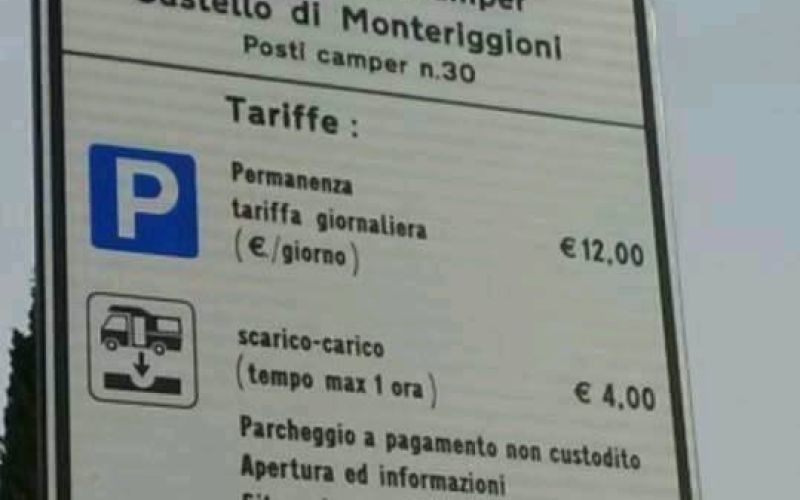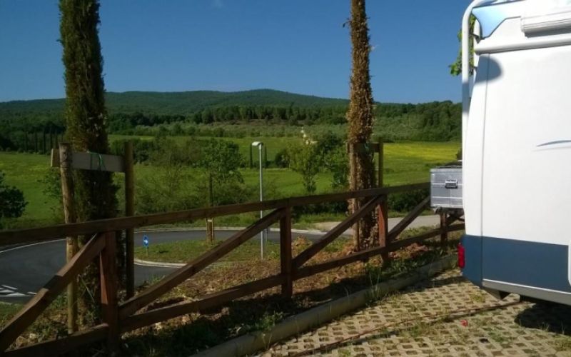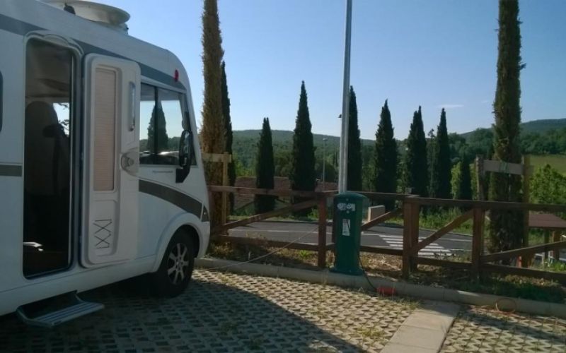 Area camper con 40 stalli attrezzati presso il parcheggio della scuola media, vicino al bivio per Monteriggioni Castello. Accesso con card, possibilità di sosta breve/lunga o semplicemente di usufruire del CS.