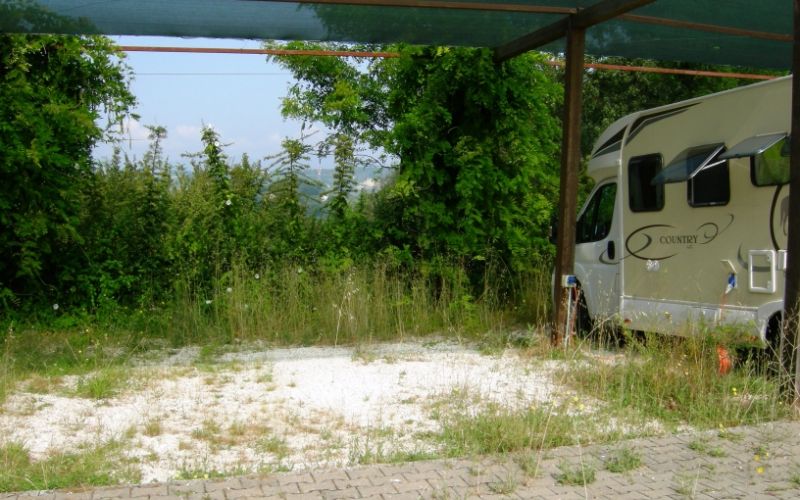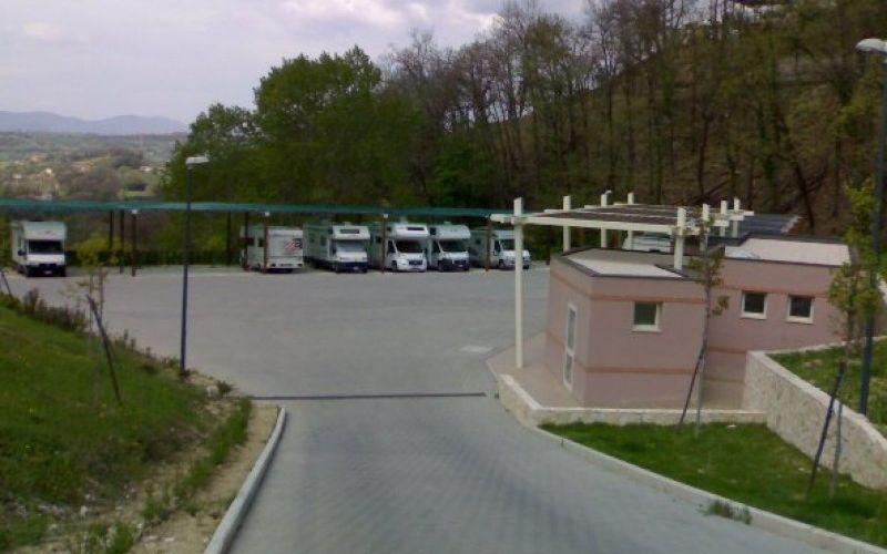 Area di sosta camper attrezzata con 16 posti, su ghiaia, con sbarra. I camperisti per poter utilizzare l’area sosta dovranno comprare un tagliando da 8 € nei negozi autorizzati ed esporlo in maniera visibile sul camper.