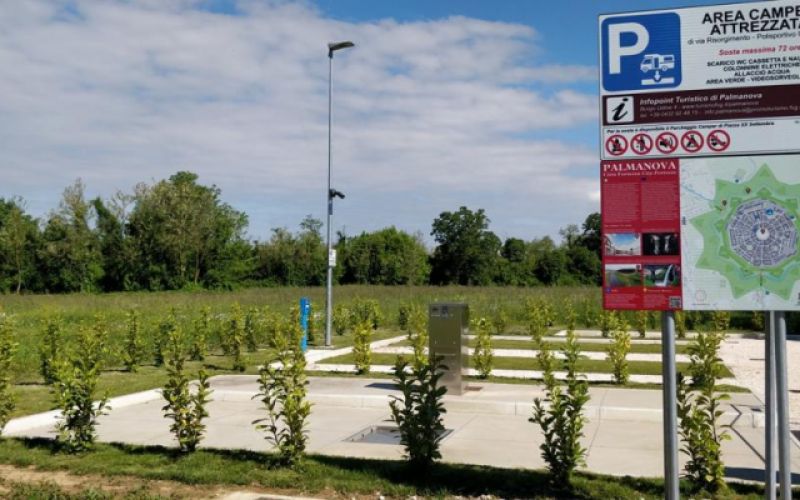 Area attrezzata con possibilità, per tre camper contemporaneamente, di usufruire dei servizi messi a disposizione gratuitamente dal Comune di Palmanova: scarico wc cassetta e nautico, colonnine elettriche, allaccio acqua, videosorveglianza, oltre alla possibilità di godere dell'area verde circostante con vista Bastioni. La distanza dal centro abitato è di 700 metri, meno di dieci minuti a piedi. Permanenza massima 72 ore. La sosta e i servizi sono gratuiti. Dal 9 luglio 2017 Palmanova è Patrimonio Mondiale dell'Umanità dell'UNESCO - 53° sito italiano nella lista. Dal 2018, uno dei Borghi più Belli d'Italia.