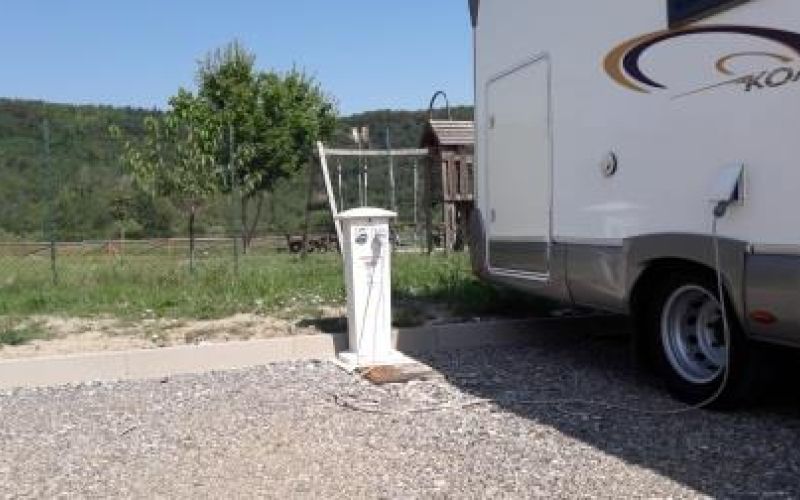 Area attrezzata con 10 piazzole per camper su ghiaia. Sempre aperta, a pagamento