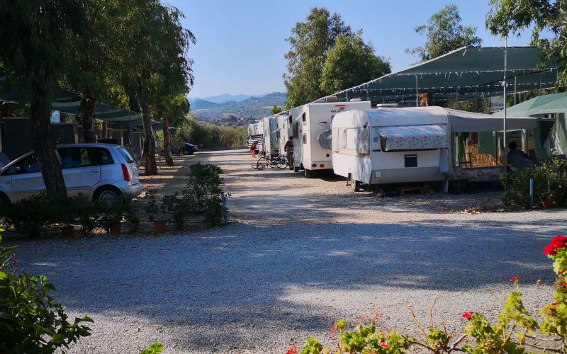 Le piazzole sono delimitate da alberi, coperte da tende frangisole e sono attrezzate con un lavabo autonomo, doccia e presa di corrente.