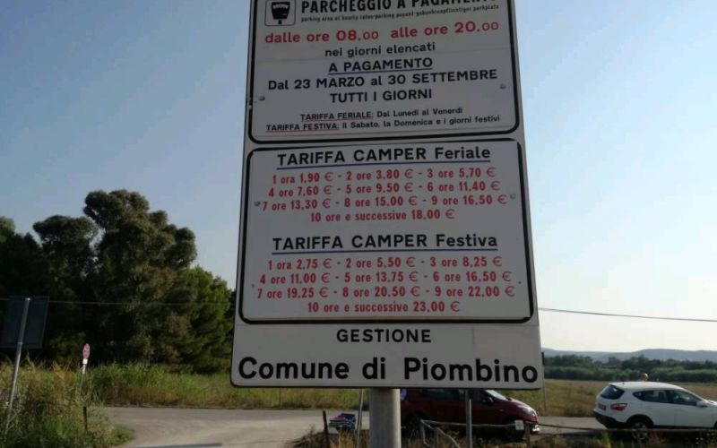 Area attrezzata per la sosta camper a Torre Mozza, nel parcheggio all'interno del Parco Costiero della Sterpaia. Aperto da Aprile a Settembre.