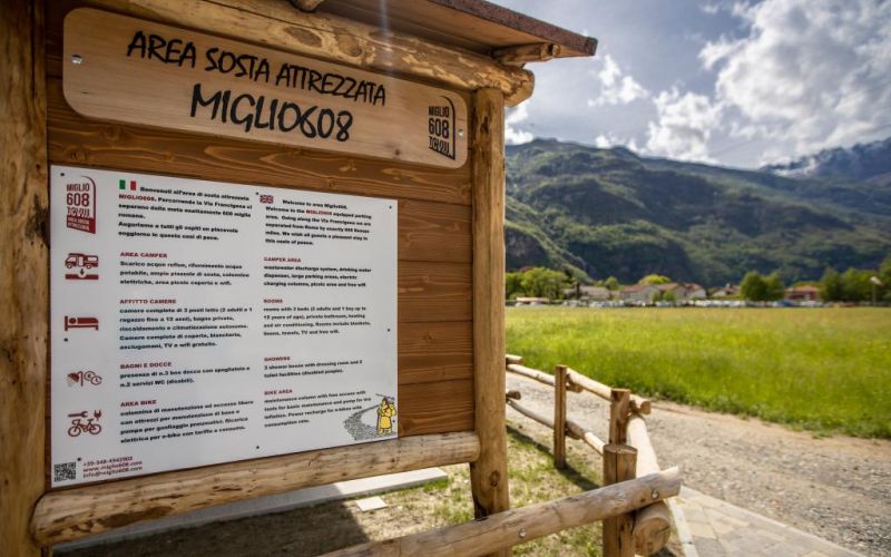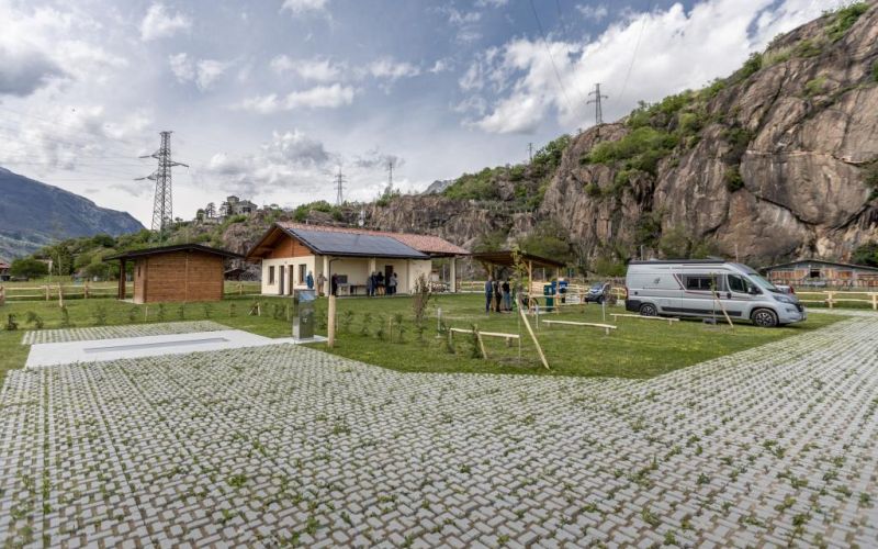 Area in zona pianeggiante in prossimità della falesia d'arrampicata della Turna e del Parco Avventura. Area con accesso gestito da cassa automatica (POS Bancario), dispone di piazzole con allacciamento elettrico, zona camper service, edificio con bagni e docce. Luogo ideale per amanti dell'arrampicata, escursionisti, ciclisti e podisti, a pochi metri dalla Via Francigena.