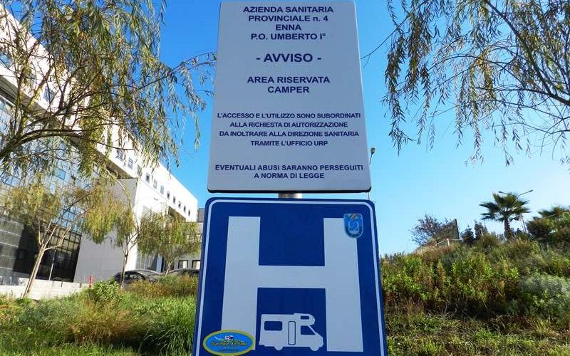 Area attrezzata per la sosta di 4 camper all'interno degli spazi di parcheggio dell'area ospedaliera di Enna. Gli spazi sono riservati ai parenti dei degenti ricoverati e va chiesta l'autorizzazione alla Direzione Sanitaria. Sempre aperta.
