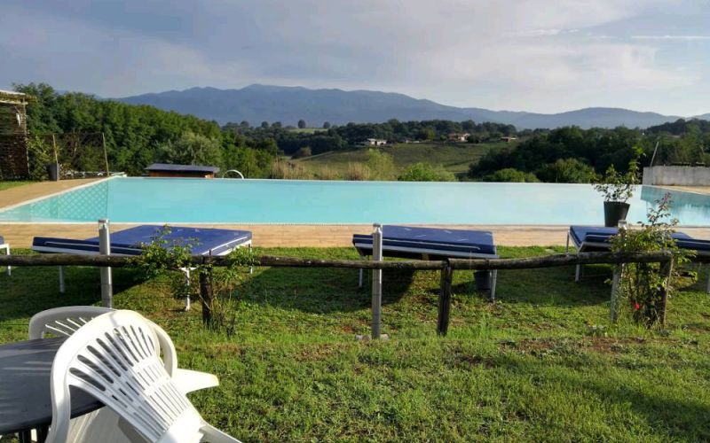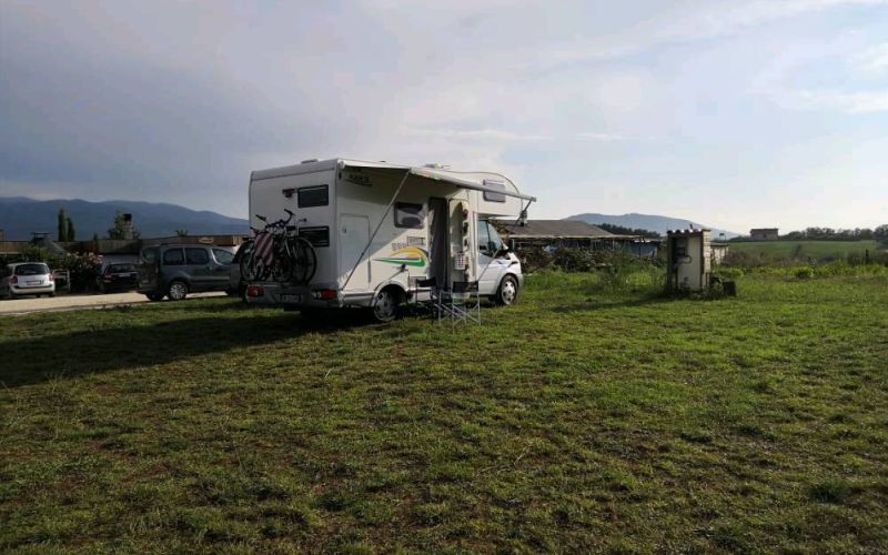 Piazzole per la sosta camper in agriturismo, su fondo erboso, delimitate, con servizio di carico scarico WC e pozzetto, docce, servizi igienici, carico acqua, elettricità, servizio navetta. Disponibile molto altro spazio senza allacci elettrici. L'agriturismo è vicino al Parco Raimbow e MagicLand e dispone di piscina, WiFi, ristorante, fattoria didattica. Apertura annuale.