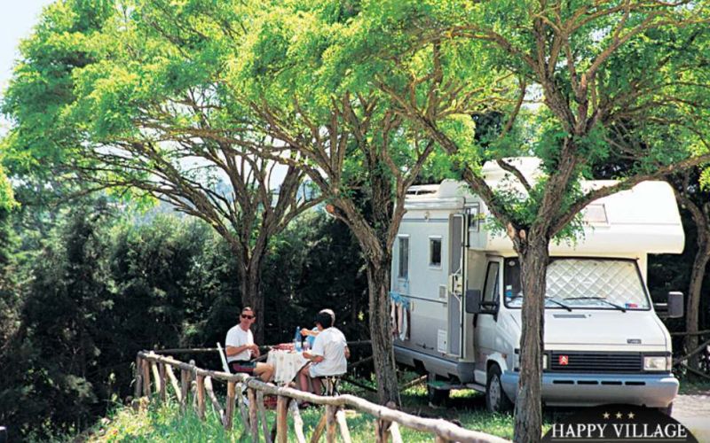 Happy Camping è un campeggio che ospita camper e caravan, è disposto su terrazze e dispone di piazzole pianeggianti e naturalmente ombreggiate, delimitate, tutte con attacchi elettrici. Il campeggio mette a disposizione un servizio di navetta gratuito che accompagna gli ospiti alla vicina stazione della metropolitana di Prima Porta che permette di raggiungere piazzale Flaminio (Piazza del Popolo) in soli 20 minuti. Aperto da marzo a gennaio.