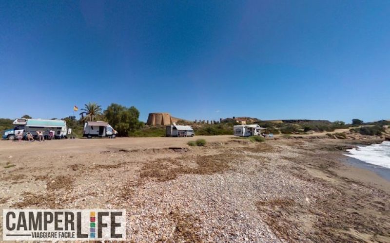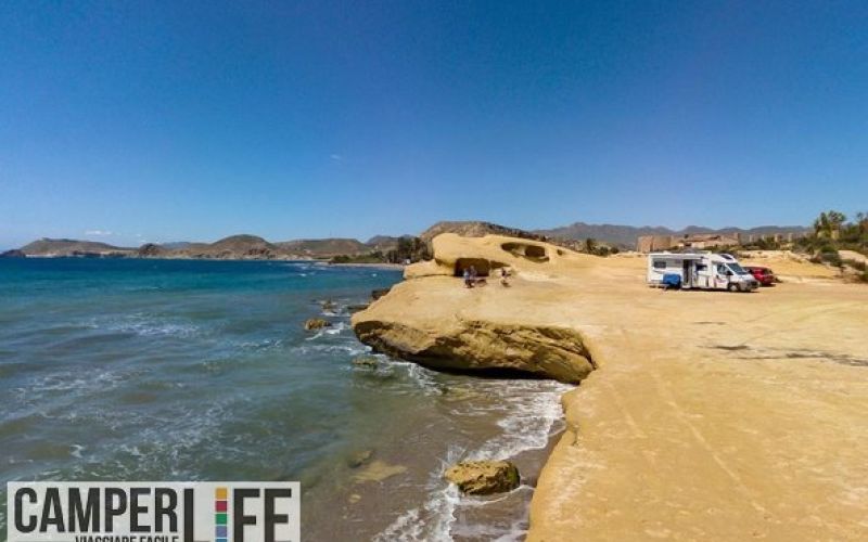 Sosta camper in area libera sul mare, alcuni km a ovest di Águilas. Gratis, senza acqua o illuminazione, si può effettuare lo scarico in un wc chimico mobile.