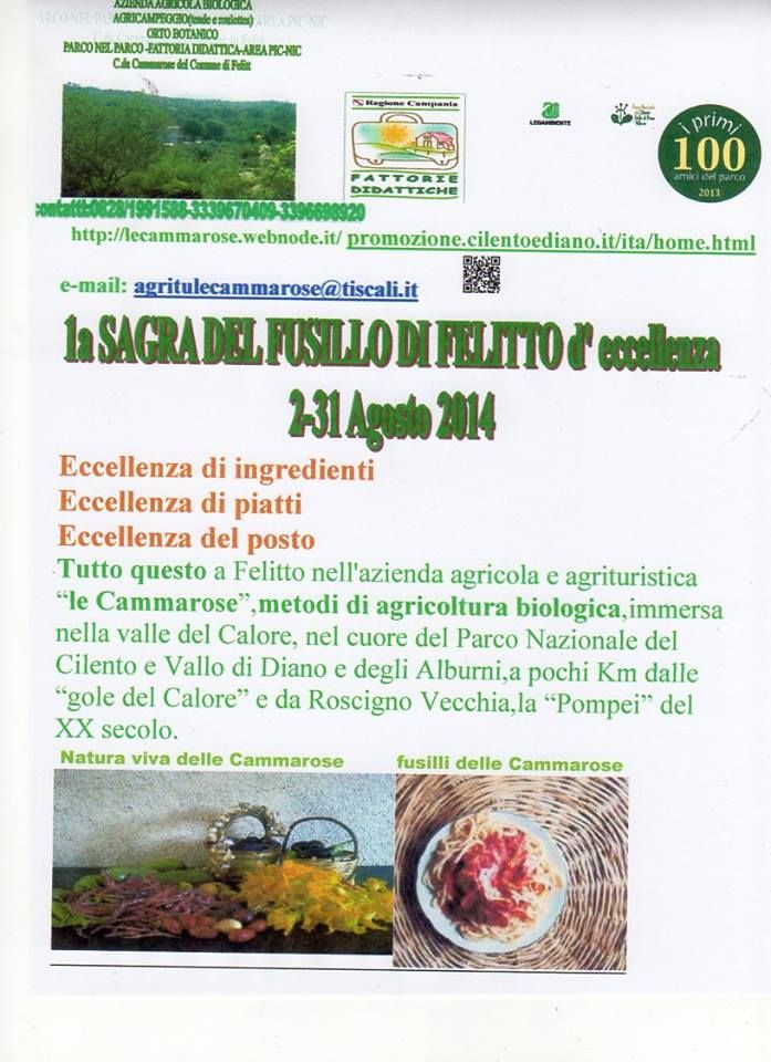 La 1^ Sagra del fusillo antico di Felitto di eccellenza dal 02-31 Agosto 2014,ha lo scopo di riproporre   il ” fusillo di Felitto” come “si faceva una volta” nell’ambito di un disegno piu’ ampio di  riscoperta, conservazione, diffusione di sapori e saperi gastronomici che ormai rischiano di andare perduti, travolti dall’omologazione,dal “pensiero unico” dominanti anche nel campo dei cibi,dei piatti,delle abitudini alimentari.