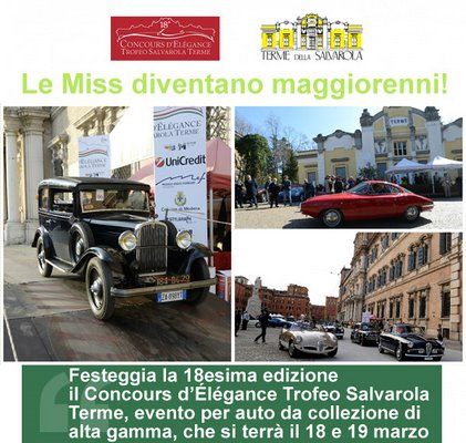 Una data importante quella che si appresta a festeggiare nel 2017 il Concours D’Élégance Trofeo Salvarola Terme - evento per auto da collezione di alta gamma di tuti i marchi. Il 18 e 19 marzo prossimi infatti l’importante manifestazione spegnerà 18 candeline, celebrando tanti anni di successi dovuti a una sinergia di amore per il territorio, splendidi esemplari d’epoca, marchi mitici, piloti appassionati e pubblico entusiasta. Il concorso, organizzato in collaborazione con Terme della Salvarola e la Terra delle Rosse, con i Musei Ferrari di Maranello, il MEF di Modena, il Registro Lancia Aurelia, il Museo dell’Antica Ceramica Marca Corona, ACI Modena, la collaborazione di BPER Banca, dei Comuni di Sassuolo e di Modena, vedrà come special guest il Registro Lancia Aurelia. Quest’anno inoltre avremo la partecipazione del Circolo della Biella, il club di Auto d’Epoca più prestigioso di Modena, che nell’ambito del Concorso ha fissato il Collectors Meeting del trentennale.