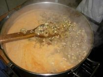 Quest'anno durante la festa vengono 'sfornati' circa 50 quintali del piatto tipico (quasi 15 mila porzioni), cucinati 'espresso' con due cotture al giorno di circa quattro ore l'una (la prima dalle 5 del mattino, la seconda dalle 14) con la garanzia per il consumatore non solo di materie prime di elevata qualità ma anche di poter degustare ed assaporare un piatto cucinato praticamente al momento – quindi 'freschissimo' – servito, come tradizione vuole, in fumanti scodelle di coccio come un tempo, accompagnato da pane fresco e buon vino. In tavola anche altri prodotti tipici ed eccellenze dell’autunno contadino locale: lardo e salame nostrani, polenta abbrustolita e fresca, Provolone Valpadana dop con Mostarda Cremona, raspadùra (soffici nuvole di Grana Padano raschiate con la lama di un coltello) e la ‘Torta rustica dei morti’, squisita ricetta creata in esclusiva per la festa e cucinata una sola volta l’anno in questa occasione.