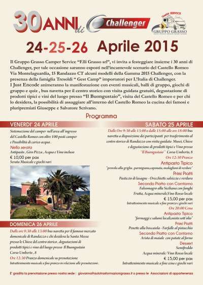 Il Gruppo Grasso Camper Service “F.lli Grasso srl”, vi invita a festeggiare insieme i 30 anni di Challenger , per tale occasione saranno esposti nell’incantevole scenario del Castello Romeo Via Montelaguardia ,15 Randazzo CT alcuni modelli della Gamma 2015 Challenger , con la presenza dei dirigenti Challenger e la famiglia Tresoldi importatori per L’Italia di Challenger. I Just Encode animeranno la manifestazione con eventi musicali, balli di gruppo, giochi di gruppo e quiz, bus navetta per il centro storico con visita guidata gratuiti, degustazione di prodotti tipici e vini del luogo presso “Il Buongustaio”, visita del Castello Romeo e a chi lo desidera, la possibilità di assaggiare all’interno del Castello Romeo la cucina dei famosi e pluripremiati Giuseppe e Salvatore Scrivano .