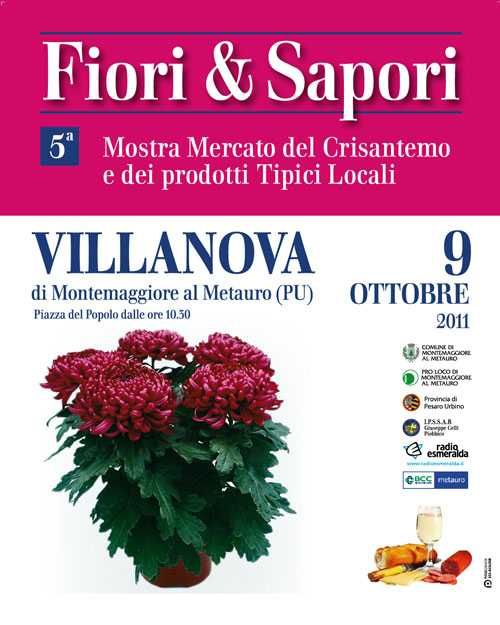 Il Comune di Montemaggiore in collaborazione con la locale Pro-Loco, l’Istituto Comprensivo “G. Leopardi” di Saltara, le associazioni cittadine Sconfini e A.G.I.L e l’Istituto Alberghiero di Piobbico e con il patrocinio della Provincia di Pesaro e Urbino ripropone in data domenica 9 ottobre nella frazione di Villanova quello che è ormai diventato un evento abituale e molto partecipato di inizio autunno ovvero la mostra mercato “Fiori e Sapori”.