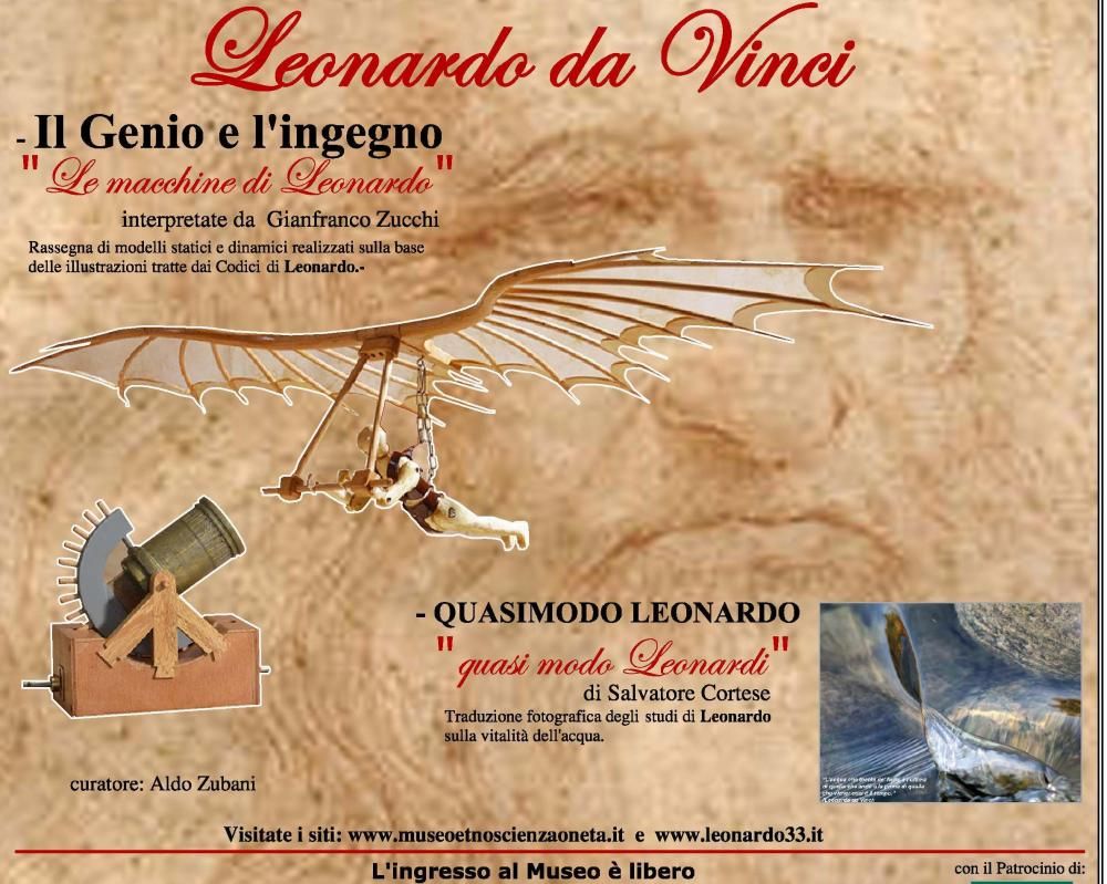 L'amministrazione comunale di Oneta, in collaborazione con l'associazione Club 33 di Rodengo Saiano, propone dal 18 ottobre al 26 dicembre presso la nuova sede del Museo Etnografico, in Via Villa, un doppio evento alla scoperta di LEONARDO DA VINCI. Due le mostre in programma: la prima riguardante "IL GENIO E L'INGEGNO - LE MACCHINE DI LEONARDO", rassegna di modelli statici e dinamici realizzati sulla base delle illustrazioni tratte dai Codici di Leonardo. La seconda "QUASIMODO LEONARDO - QUASI MODI LEONARDO", traduzione fotografica degli studi di Leonardo sull'acqua.