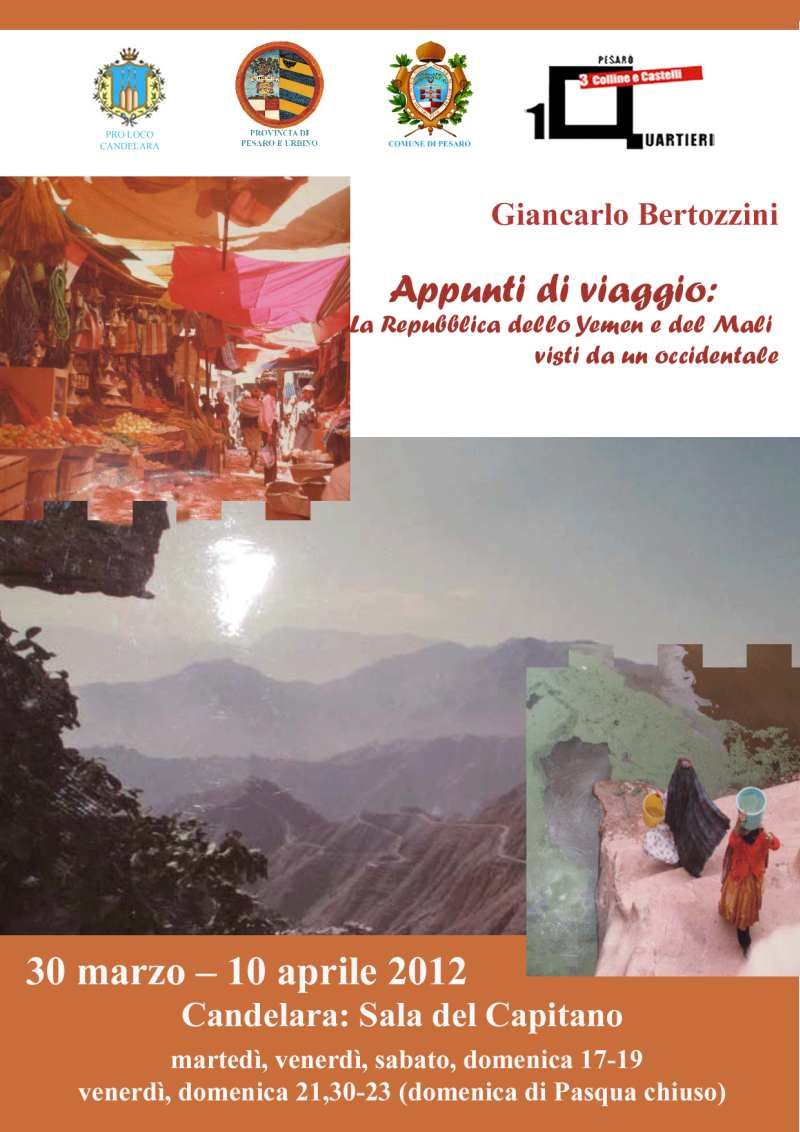 Nella sala del Capitano sono esposte le venti tavole del suo viaggio nella Repubblica del Mali nel 1980 e quelle nella Repubblica dello Yemen nel 1981. Le date di questo viaggio lasciano intuire come Bertozzini si sia messo a capo di quest’avventura in tempi in cui non ancora non era di moda fare questi lunghi e avventurosi viaggi! Infatti, Giancarlo spesso ricorda di aver dormito per terra su materassi di fortuna o in capanne com’è abitudine tra le popolazioni locali! Alcuni scatti sono stati fatti di nascosto, perché ad esempio è vietato fotografare le donne, ma non le bambine prima del passaggio all’adolescenza! Queste e tante altre curiosità ci racconterà Giancarlo Bertozzini durante l’inaugurazione della mostra presso l’ex-Palazzo Municipale di Candelara venerdì 30 marzo alle ore 21.00; seguirà poi la visita alla mostra. La mostra rimarrà aperta fino a martedì 10 aprile 2012, con questi orari: mercoledì, venerdì, sabato, domenica dalle 17 alle 19; il venerdì e domenica anche dalle 21.30 alle 23 (domenica di Pasqua la mostra rimane chiusa).