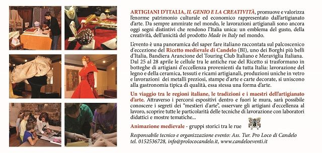 Uno dei più belli d'Italia, circondato da torri e mura medievali: è il Ricetto di Candelo le origini risalgono al periodo a cavallo tra il XIII ed il XIV secolo, ed è sicuramente il meglio conservato di tutti i ricetti del Piemonte, tanto che oggi molte cellule sono diventate atelier di artisti ed artigiani, dove prendono vita opere figurative, strumenti musicali, prodotti artigianali del legno, del ferro battuto, della ceramica, del tessile e del vetro. Oltre che nelle eccellenze, l’evento sarà per i visitatori anche un tuffo nel passato: tra le rue, le stradine acciottolate nel cuore del borgo, musica d'epoca e attori in abiti medievali ad animare il centro storico, trasformato in enorme palcoscenico all'aperto.