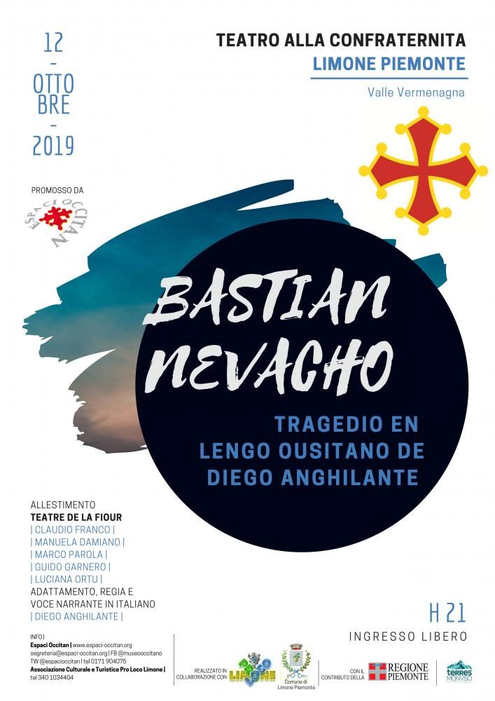 Premiata nel 2011 dalla Regione Piemonte nell’ambito del concorso “Premio per un testo teatrale nelle lingue del Piemonte” e nella sezione teatro del Gran Jo Flourau del Felibrige francese, “Bastian Nevacho” è stata pubblicata nel 2012 in un volume dal Centro studi piemontesi di Torino. Nel 2018 l’autore insieme ad alcuni attori, dilettanti ma di madrelingua occitana, hanno, poi, deciso di metterla in scena.