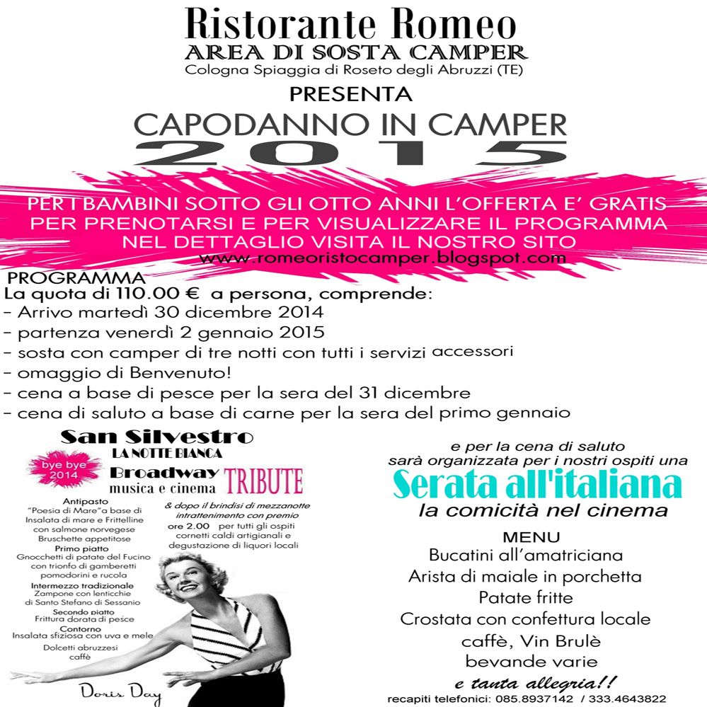 Il capodanno è alle porte e la festa sta per avere inizio. Al “Ristorante Romeo” vi aspettiamo con un’atmosfera scintillante, per un viaggio nell’epoca dei musical. E’ il 1950 ed il cinema di Broadway farà da scenografia al gran veglione. Un programma all inclusive (sosta più ristorante) tutto da vivere con omaggi e sorprese. In più per i soci di “Camperlife” è riservato uno sconto del 10% sulla tariffa adulto, mentre per i bambini sotto gli otto anni l’offerta è gratis.