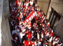 Dietro al bove corre una moltitudine di persone, molte vestite con il tradizionale guazzarò, un antico abito con-tadino da lavoro.