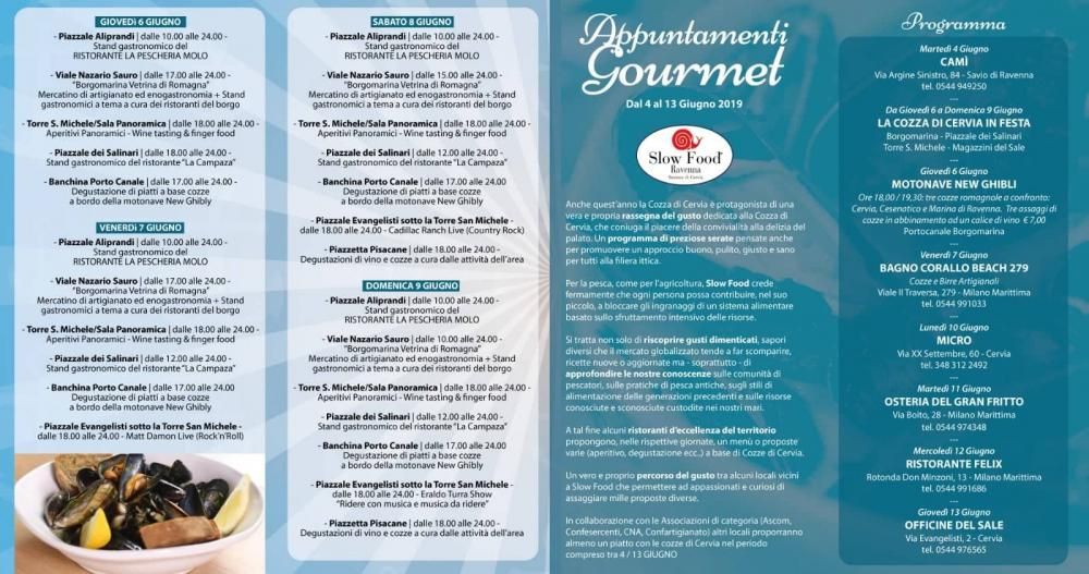 Fresca, saporita, con ottime proprietà organolettiche e nutritive, la cozza a Cervia è regina della tavola: un prodotto a km 0, biologico e buonissimo, allevato in acque controllate e locali, proprio a poche miglia dalla costa. La sua festa è a giugno, quando per quattro giorni il porto canale della città si anima di stand gastronomici e i tanti ristoranti della città propongono menù speciali, dedicati a questo prezioso regalo del mare da gustare sia come snack da passeggio che in prelibati piatti della tradizione e gourmet.