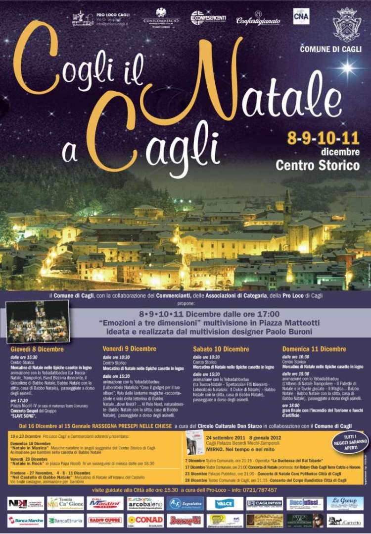Vi aspettiamo a Cagli con "Cogli il Natale a Cagli" - Mercatino Natalizio, Animazione, Emozioni a tre dimensioni in Multivisione, Visite Guidate, Mostre, Concerto Gospel, Fuochi artificiali con incendio del Torrione Martiniano.