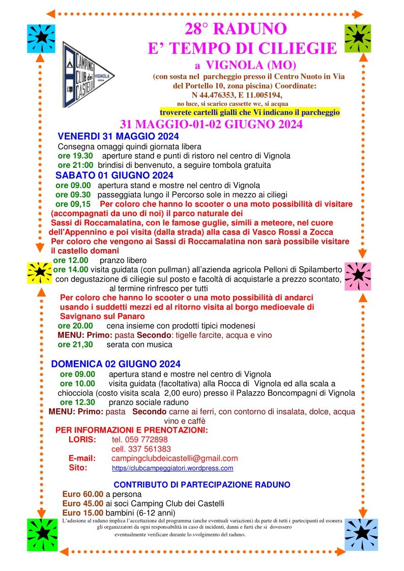 | LORIS: | tel. 059 772898 cell. 337 561383 campingclubdeicastelli@gmail.com https//clubcampeggiatori.wordpress.com |