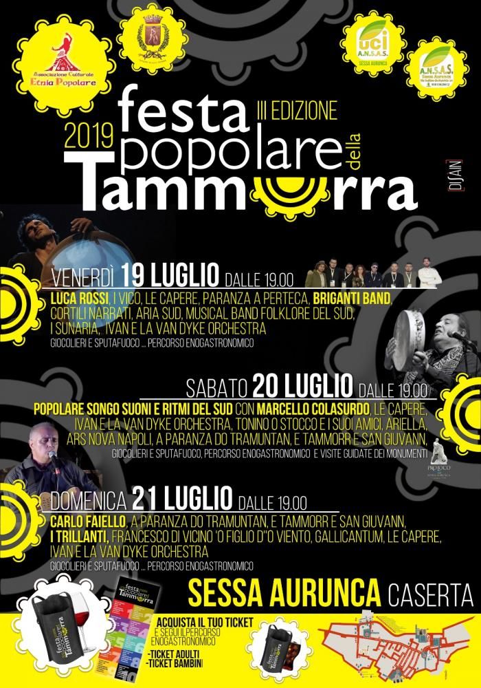 Il 19-20-21 Luglio 2019 a Sessa Aurunca (provincia di Caserta) si svolgerà la III^ Edizione della Festa Popolare della Tammorra, una manifestazione ormai consolidata e attesissima dagli appassionati e non del genere popolare. Evento promosso dall'associazione "Etnia Popolare" con il patrocinio del comune di Sessa Aurunca. Questa festa ha dichiarato Carmine Paolucci, Presidente di "Etnia Popolare" nasce dalla passione per la musica popolare e dal desiderio di vedere il proprio paese, esprimere al meglio le proprie potenzialità. Una manifestazione dunque che unisce tanti aspetti importanti, come la promozione e la scoperta del territorio ed il rispetto dei luoghi e delle tradizioni, il tutto accompagnato dalle note coinvolgenti della musica popolare. Una tre giorni dedicata, non solo alla musica popolare, ma anche ai prodotti enogastronomici del territorio e alle bellezze di Sessa Aurunca, città con origini preromaniche. Nel centro storico verranno allestiti stand dove verranno distribuite le specialità del territorio, artisti di strada faranno da cornice a scenografie bellissime, gruppi itineranti suoneranno in ogni angolo della città e chiunque respirerà un'aria di festa.