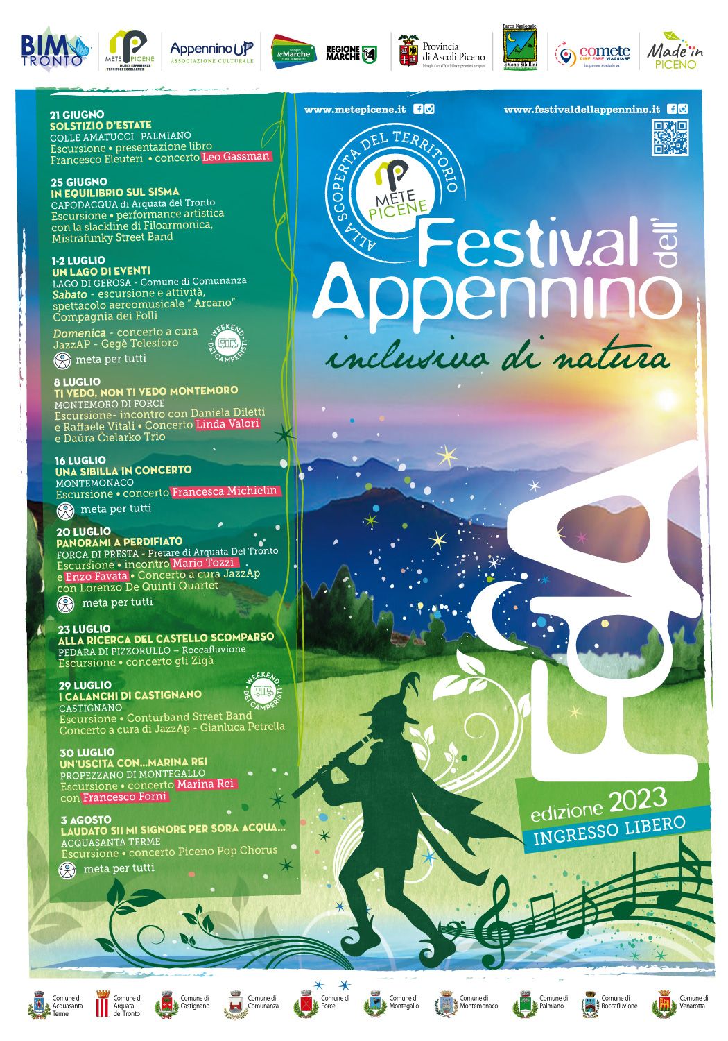 Il Festival promosso dal BIM Tronto, con Mete Picene, brand di destinazione turistica del Piceno propone 10 appuntamenti, dal 21 giugno al 3 agosto, attraverso escursioni, racconti, tradizioni, eccellenze, cultura e spettacolo, nel segno dell’inclusività, cara a Mete Picene, che dal 2019 promuove un nuovo modello di turismo esperienziale altamente sostenibile. Un’opportunità unica per promuovere il Piceno e le sue aree interne come destinazione turistica outdoor, ma anche per valorizzare le eccellenze “Made in Piceno” grazie alla presenza dei produttori e delle attività locali: ogni tappa percorrerà un piccolo ma prezioso tratto del nostro Appennino in sostegno dell’economia locale, della comunità, della ricostruzione di un’identità culturale e dell’inclusività sociale.