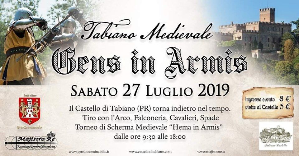 Grande festa medioevale sabato 27 luglio al Castello di Tabiano: nella fortezza del XI secolo che domina sulla pianura padana, si potranno ammirare duelli con la spada, gare di tiro con l’arco storico e il magico spettacolo della falconeria. Cavalieri in armatura si sfideranno in un vero e proprio torneo di scherma "HEMA in Armis", una disciplina unica nel suo genere, realizzata in collaborazione con l’associazione Majistro RE. Sono previste didattiche sulla falconeria, la nobile arte praticata da re e imperatori, si potrà imparare dagli arcieri come centrare il bersaglio o scoprire la storia della spada dai ‘maestri’ della scuola d’arme ‘Gens in Armis’ della famosa compagnia ‘Gens Innominabilis’.