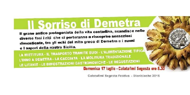 “Il sorriso di Demetra” è un’iniziativa culturale inserita nel cartello di eventi del “Calatafimi Segesta Festival”che si prefigge di conciliare il mito classico della Dea Demetra alle secolari tradizioni contadine legate al ciclo del grano. L’iniziativa darà la possibilità di far vivere un’esperienza unica in una dimensione senza tempo.
