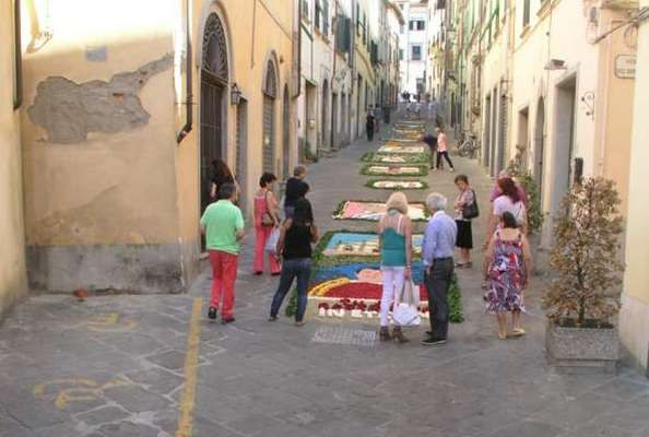 a partire da sabato pomeriggio le 4 strade principali del centro di Fucecchio (piccola città nel cuore della Toscana, a mezza strada tra Firenze e Pisa sulla Fi-Pi-Li, posta lungo l'antica via Francigena con un interessante centro storico, città che ha dato i natali ad Indro Montanelli e dove sono visitabili le sue stanze di Roma e Milano fedelmente ricostruite con tutti materiali originali) si ricopriranno di splendidi tappeti colorati realizzati principalmente con petali di diori sminuzzati ma anche semi foglie....Quest'anno il tema principale sarà "il dono più grande... la vita" ma ci saranno ache quadri dedicati a ricorrenze speciali e 4 quadri fatti dai bimbi e ragazzi delle scuole dedicati a Fucecchio ( "Fucecchio, storia, cultura e tradizioni" )