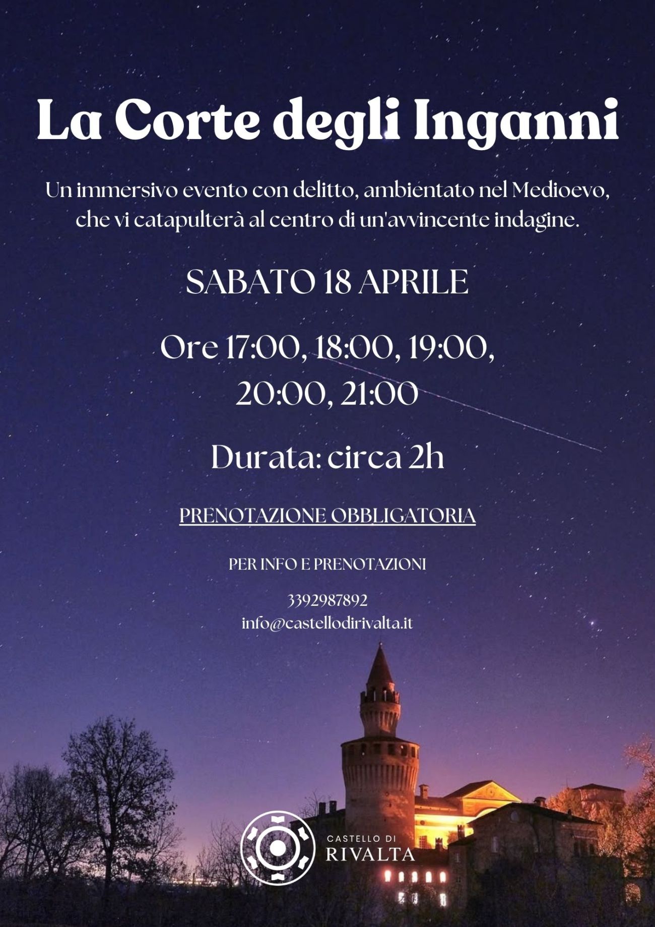 Prenotazione obbligatoria 3392987892 - info@castellodirivalta.it