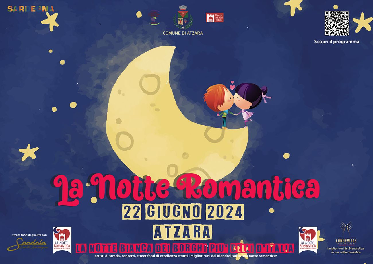 Saranno due gli eventi che, sabato 22 giugno 2024, a partire dalle ore 20:00, animeranno Atzara, con una notte bianca ricca di spettacoli e iniziative: la manifestazione nazionale “La notte romantica nei Borghi più belli d’Italia” e "Longevitas Mandrolisai, long life wine festival", (VAI ALLA PAGINA) il grande evento sul vino del Mandrolisai con 20 aziende vitivinicole del territorio e due ospiti di eccellenza, la cantina La Contralta con i suoi vini e l'Associazione S'Andala con l'offerta di street food di eccellenza.
