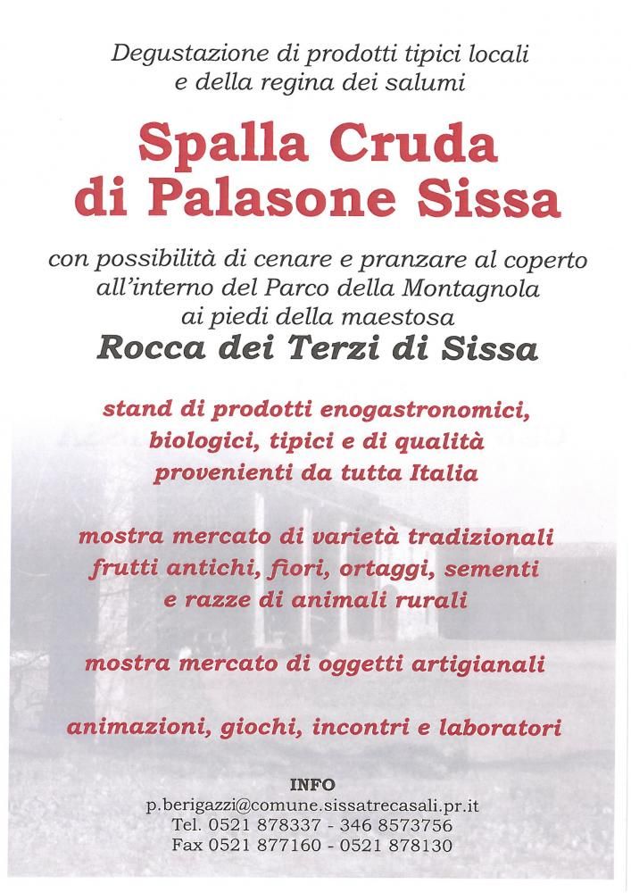 La manifestazione promossa dall’Amministrazione Comunale di Sissa Trecasali con la collaborazione dell’ Associazione Anziani di Sissa e l’Associazione Alpini Sissa Trecasali, vuole promuovere la valorizzazione di un prodotto tipico locale di notevole valore quale è la SPALLA CRUDA DI PALASONE SISSA.