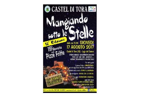Un occhio al piatto e l’altro rivolto verso l’alto. Sarà difficile, d’altronde, scegliere tra le delizie della tradizione reatina e un cielo stellato che lascia senza fiato. Giovedì 17 agosto torna a Castel di Tora l’appuntamento con “Mangiando sotto le stelle”, la manifestazione - giunta alla 12esima edizione - che abbina le degustazioni enogastronomiche alla possibilità di godere dello spettacolo che offre la volta celeste vista dagli alti affacci del centro storico castelvecchiese; il tutto all’interno di uno dei borghi più belli d’Italia, arroccato sulle rive del Lago del Turano, tra spettacoli folcloristici e musicali.