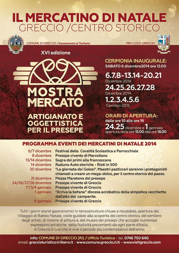 Ad accogliere i visitatori in un ambiente magico e familiare, fatto di colori, luci, sapori e musica, sarà un sapiente mix di eccellenze tra arte presepiale e artigianato, una miscela di tradizione, presepi artistici, decorazioni natalizie, artigianato in legno, vetro, metallo, ceramica, sculture, ricami, pizzi, merletti e prodotti tipici locali. Nel suggestivo percorso fra le casette di legno, sarà possibile trovare originali idee regalo, intrattenersi presso il Villaggio di Babbo Natale e gustare le specialità gastronomiche della zona. Ricchissimo il programma degli eventi. Il 6 e 7 dicembre è previsto il Festival della Coralità Scolastica e Parrocchiale, mentre l’8 andrà in scena il Presepe vivente di Marcellano; il 13 e 14 si tornerà indietro nel tempo con la Sagra dei primi alla francescana e il Raduno auto storiche “Rieti in 500” (solo nella giornata del 14); il 20 dicembre sarà la volta della “Giornata dei Golosi”, con maestri pasticceri che creeranno un mega-dolce per il centro storico del paese, mentre il giorno successivo è in programma la Mezza maratona del presepe. Il 24, 26, 27 e 28 dicembre, e ancora l’1, 3, 4 e 6 gennaio andrà in scena il Presepe di Greccio, unico e inimitabile, mentre il 5 gennaio ci sarà la discesa acrobatica della Befana dall’alto del campanile.
