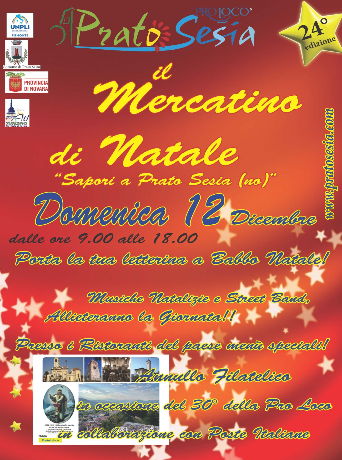 In occasione dei 30 anni della Pro Loco, in collaborazione con le Poste Italiane e il Comune di Prato Sesia, dalle 10.00 alle 16.00 sarà presente la postazione filatelica delle Poste Italiane per lo speciale annullo filatelico su una cartolina dedicata.