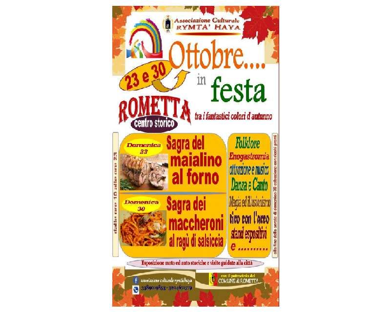 L'associazione culturale Rymta Haya (Rometta Vive) con il patrocinio del Comune di Rometta organizza domenica 23 e domenica 30 ottobre l'evento enogastronomico allietato da musica canti folklore stand espositivi e tanto altro a Rometta ed al proposito qui di seguito viene riportata la presentazione:
