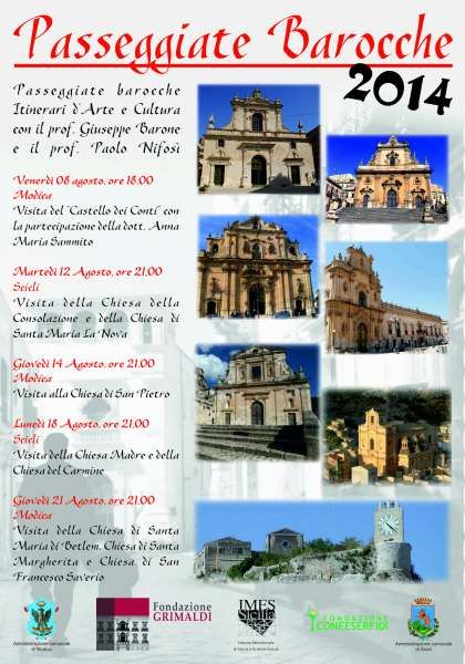 La cultura, la storia e l'arte del territorio tornano protagoniste con le “Passeggiate Barocche”. Dall'8 al 21 agosto lo storico Giuseppe Barone e dello storico dell'arte Paolo Nifosì guideranno il pubblico alla scoperta di itinerari insoliti, siti normalmente chiusi alle visite, gioielli architettonici e "perle" del barocco incastonate nei centri storici di Modica e di Scicli, regalando serate indimenticabili ai turisti e agli amanti dell'arte e della cultura.