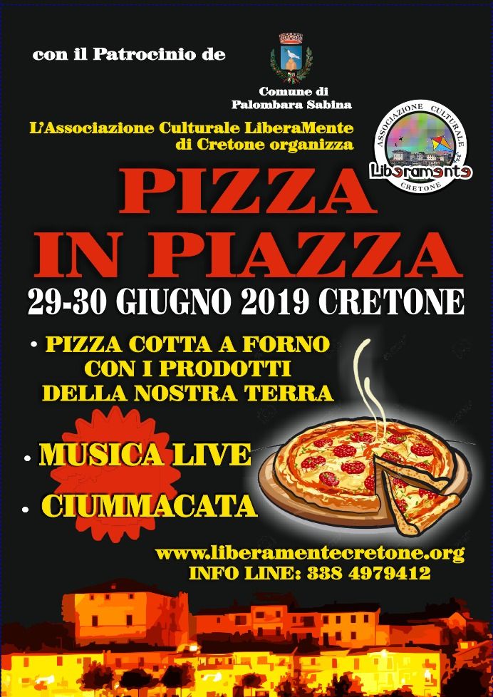 A legare tutti questi prelibati sapori sarà il prodotto di punta del territorio, l’olio extravergine di oliva DOP. Cretone, infatti, non è solo un paradiso da vivere nei primi giorni di calura estiva grazie alle sue acque termali che sgorgano naturalmente da millenni; è un caratteristico paese di origine medievale ed è un luogo di antiche tradizioni culinarie legate a doppio filo all’oro verde della Sabina. Organizzata dall’Associazione Culturale LiberaMente, “Pizza in Piazza” sarà insomma un’occasione gustosa per conoscere le tradizioni più autentiche e genuine di un piccolo borgo nascosto del Lazio, e per riscoprire i vecchi sapori di una volta. Tra una delizia e l’altra, non mancherà la frutta di stagione - pesche, ciliegie e albicocche - altro vanto della produzione agricola locale; la birra e il vino scorreranno a fiumi e le due serate saranno animate da spettacoli musicali che contribuiranno a creare quel clima di festa che solo nei piccoli borghi si riesce ancora a respirare.