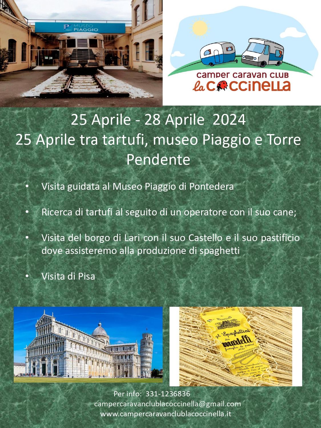 Un raduno al profumo di tartufo e di altri prodotti locali, di cultura e di spensieratezza. Seguiremo un cercatore di tartufi con il suo cane facendo una passeggiata nel bosco, visiteremo il castello di Lari e una fabbrica di pasta, visiteremo il bellissimo museo della Piaggio a Pontedera e visiteremo anche Pisa con la sua bellissima Piazza dei Miracoli. Voi dovete solo pensare a divertirvi... al resto ci pensiamo noi!