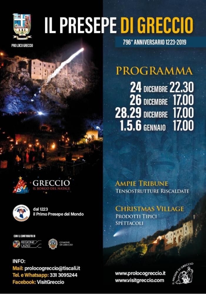 Per otto sere – il 24 dicembre alle ore 22.30 e tutti gli altri giorni alle 17.00 – sarà allestito un impianto che rappresenterà il borgo medioevale laziale e il suo castello nel 1200; tutto intorno sarà predisposto a semicerchio, in modo da creare un effetto “anfiteatro” con tribune modulari con oltre 2000 posti a sedere, mentre all’esterno delle tensostrutture riscaldate saranno capaci di contenere centinaia di persone. Non mancheranno poi le visite guidate alla scoperta del centro storico completamente ristrutturato e del sentiero degli artisti, un museo a cielo aperto con 26 affreschi che abbelliscono i muri esterni delle case antiche. Sarà inoltre possibile ammirare il Museo dei Presepi, che accoglie diverse espressioni artistiche della Natività e la statua, alta ben 5 metri, raffigurante San Francesco