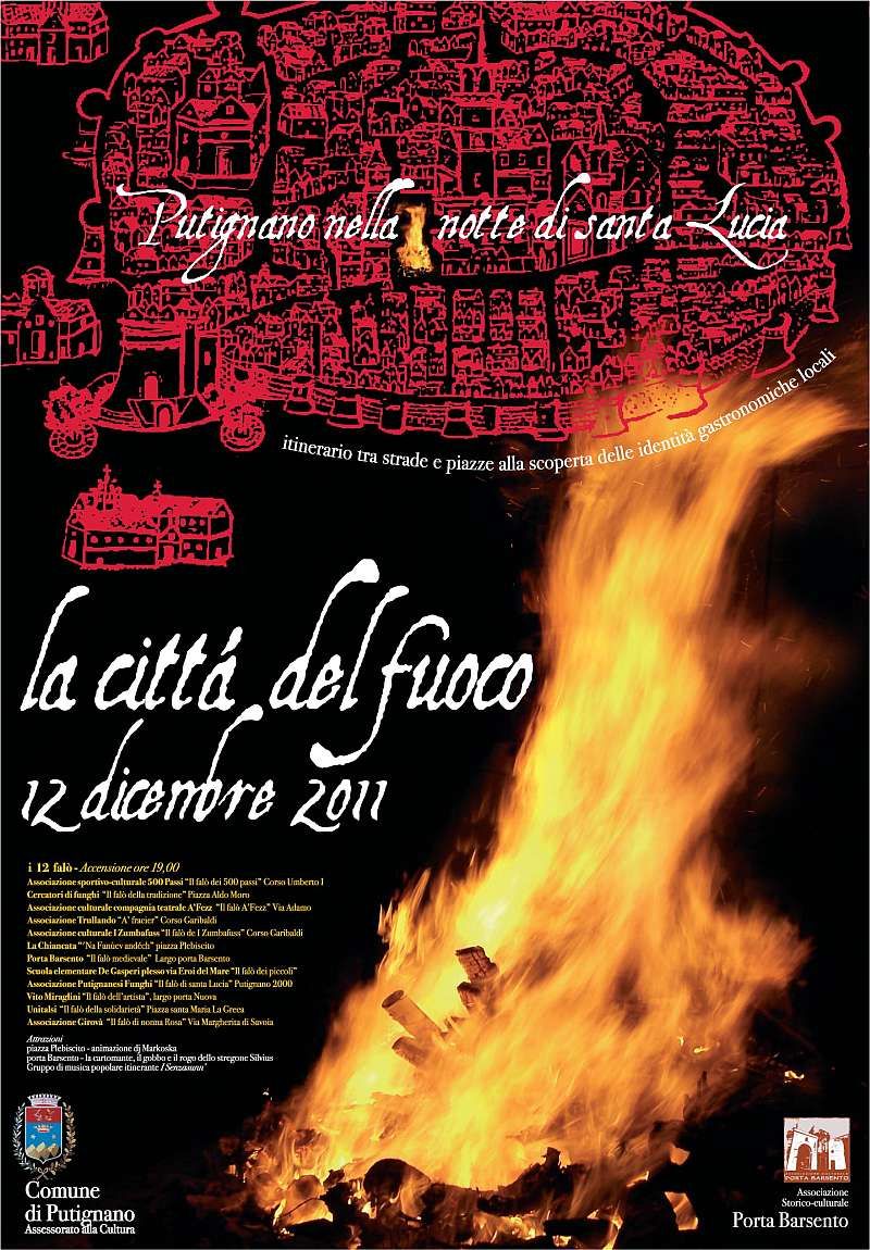 Un vero e proprio itinerario del fuoco. Lunedì prossimo 12 dicembre appuntamento con la tradizione a Putignano. Dalle 19 in poi, grazie ad associazioni culturali, scuole, privati, e la regia dell’associazione storico-culturale Porta Barsento, verranno accesi contemporaneamente dodici falò, piccoli e grandi, per illuminare e riscaldare la vigilia di santa Lucia. Il percorso guidato comincia da corso Umberto I e piazzale Moro. Quindi si entra nel centro storico dove ci sono ben cinque falò tra via Adamo, corso Garibaldi, piazza Plebiscito e piazza santa Maria la Greca. Tre invece quelli a ridosso del centro storico: a porta Barsento, porta Nuova e in via Margherita di Savoia. Due più decentrati: in una traversa di via Alberobello il falò della scuola di via Eroi del Mare e a Putignano Duemila.