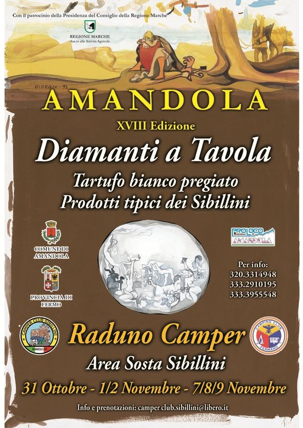 Dal 31 ottobre al 02 novembre e dal 07 novembre al 09 novembre ad Amandola (Fm) Mostra mercato del Tartufo Bianco Pregiato e prodotti tipici del posto, unica nel suo genere in quanto i Diamanti "Tartufi" esposti sono venduti dai "Cavatori" del posto e si possono degustare lungo la via del gusto che si estende all'interno del caratteristico centro storico.
