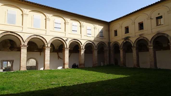“Il chiostro fu ampliato nell’anno 1693 sulla base di una struttura preesistente, probabilmente coincidente con il lato sul quale sono tuttora visibili lacerti di affreschi del 1400 raffiguranti una santa martire e san Leonardo di Tongres protettore dei carcerati, per volontà e spese di padre Giovenale Sisti, Vicario Generale dell’ordine agostiniano, come si legge in una targa sormontata da stemma araldico presente tra due archi “CLAVSTRVM HOC FVNDITVS SVIS SVMTIBVS EREXTIT P.B. IVVENALIS SISTI NARN. AD 1693”