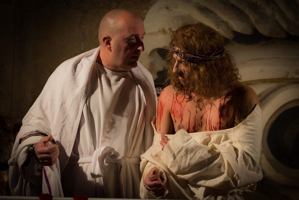 2. Le Scene della vita di Gesù sulla collina di Mezzosso (Il Calvario). La collina funge da teatro naturale dove è allestita la platea con 600 posti a sedere. Qui viene rappresentata la vita di Gesù dalla Sua nascita alla Sua Crocifissione, che è poi l’epilogo della manifestazione. Poco prima della Crocifissione il Corteo, proveniente dal paese, entra anch’esso in scena divenendo così parte attiva della Rappresentazione. Il tutto terminerà attorno alle 23:45.